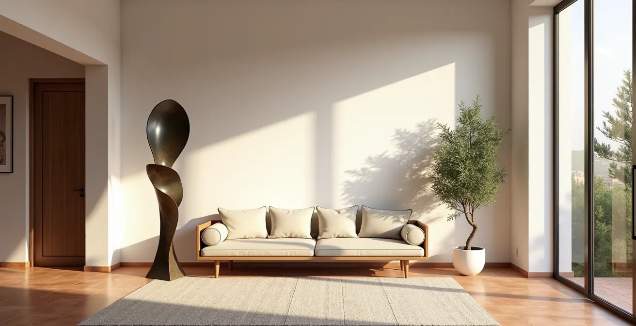 Los consejos habituales suelen ser vagos: «compra algo que te guste», «asegúrate de que combine con los cojines». Estos enfoques tratan una escultura como un accesorio más, ignorando su poder para alterar la percepción del espacio. Pero, ¿y si te dijera que el enfoque está equivocado? No se trata de «decorar», sino de realizar una inversión arquitectónica. La clave no está en llenar un hueco, sino en seleccionar una pieza que dialogue con la luz, que cree nuevos puntos focales y que dirija la narrativa visual de tu hogar.