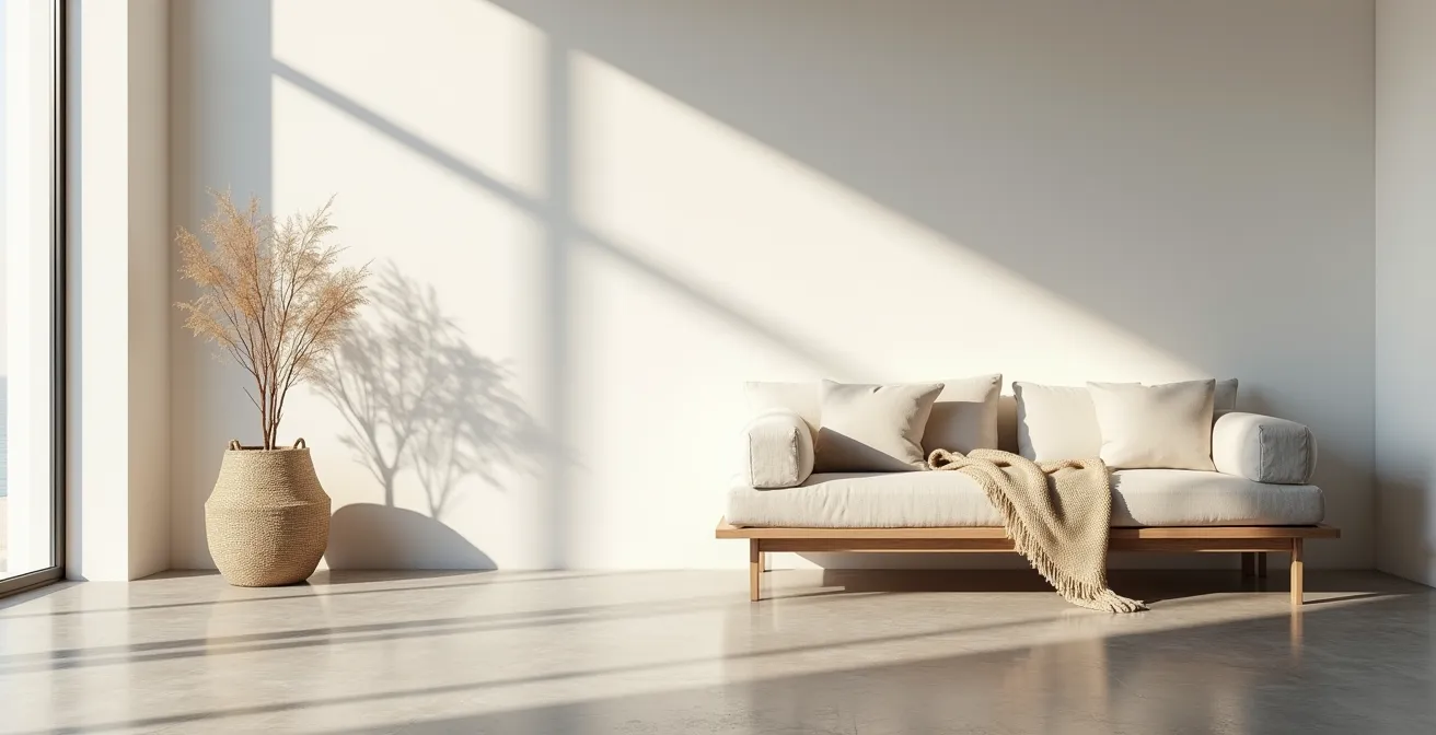 Pero, ¿y si la clave no fuera simplemente «añadir naturaleza», sino orquestar un diálogo sensorial? La verdadera estrategia para humanizar un espacio contemporáneo no reside en la cantidad de texturas, sino en la calidad de su interacción. Se trata de entender que una simple manta de lana puede calentar una habitación entera sin necesidad de tocarla, que el contraste entre el hormigón y el mimbre puede ser más potente que una pared entera de madera, y que la calidez no es un objeto que se añade, sino una experiencia que se diseña.